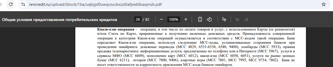 Квази-кеш операции по кредиткам «Ренессанс Банка» перечислены в «Общих условиях предоставления кредитов и выпуска банковских карт физическим лицам» на 26-й страничке.
