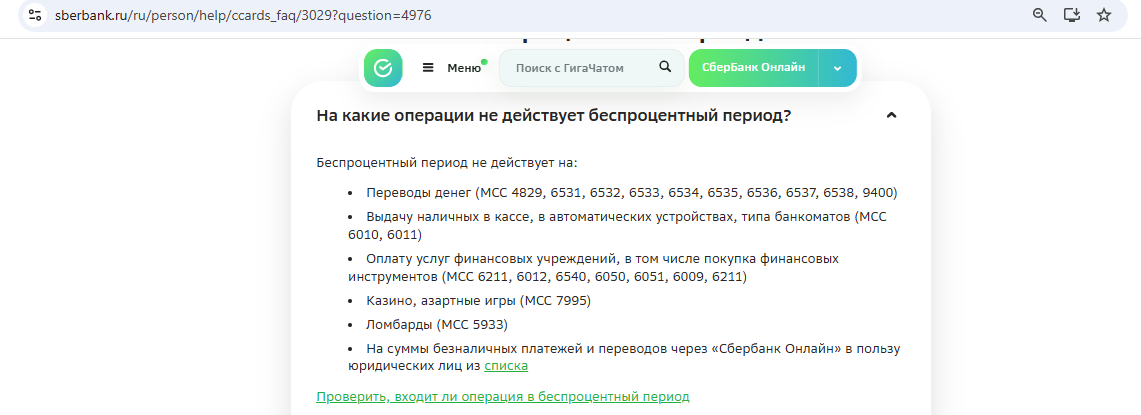 Список негрейсовых операций по картам «Сбера» можно посмотреть на этой страничке. Беспроцентный период не действует на: