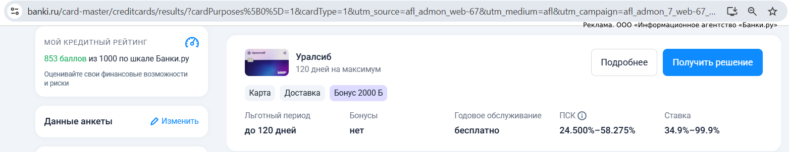 При оформлении бесплатной кредитки «120 дней на максимум» от «Уралсиба» через сервис подбора кредитных карт портала «Банки.ру» обещают начислить 2000 бонусов (=2000 рублей).