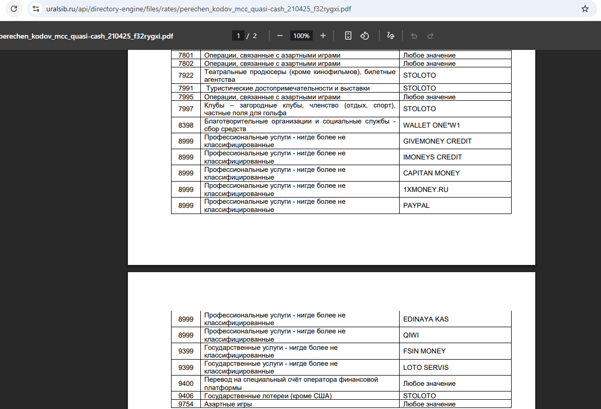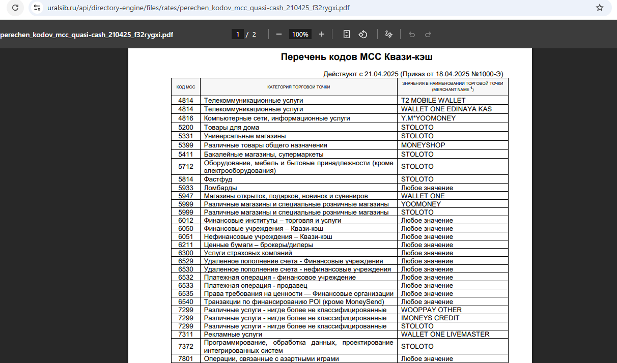 «Уралсиб» обычно раньше других кредитных организаций вносить в свои расстрельные списки новые МСС-коды и наименования торговых точек. Поэтому частенько на него можно ориентироваться в поисках вариантов обналички кредиток других банков, которые добавляют в исключения новые вещи с опозданием.
