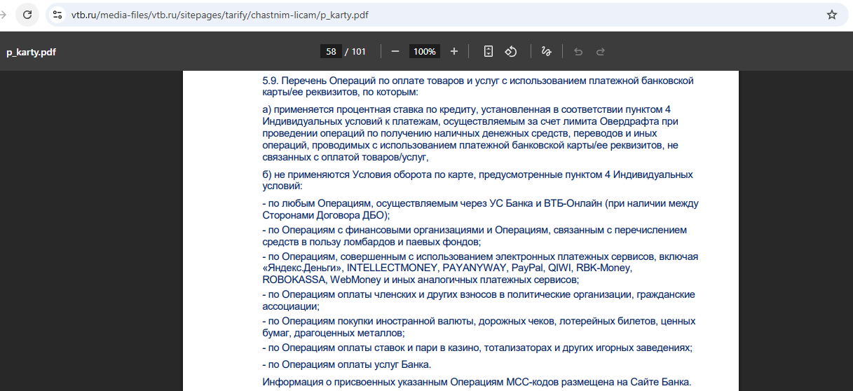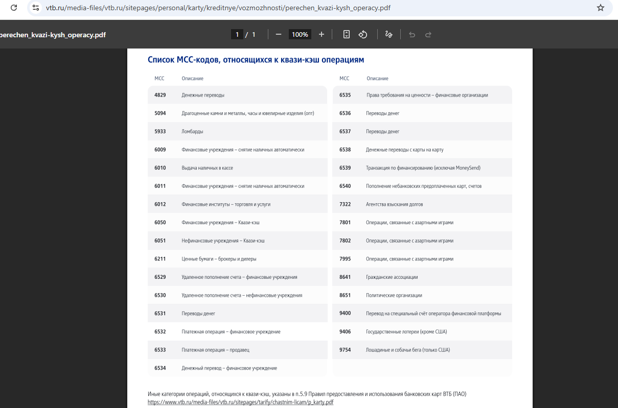 Конкретный список МСС-кодов исключений у «ВТБ» находится тут.