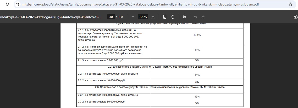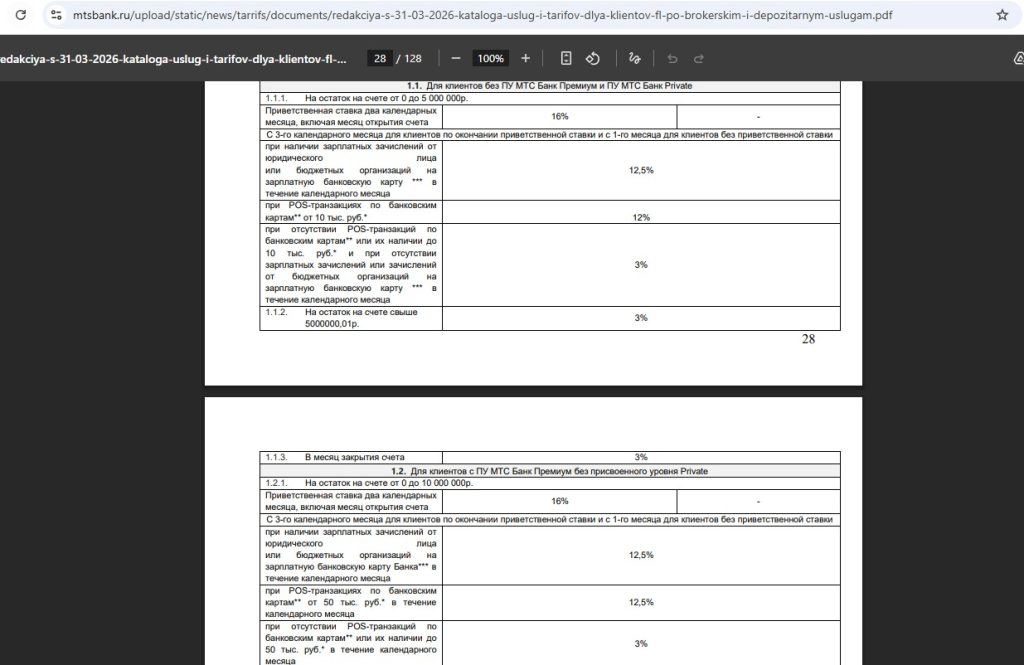 Пришлось лезть в полный сборник тарифов «МТС Банка», который действует с 24.04.2023, где удалось понять, в чём причина несоответствия.