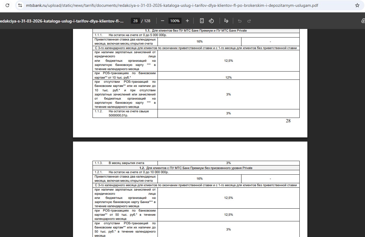 По накопительному «МТС Счёту» от «МТС Банка» с 31.03.26 в первые два месяца новичкам будет положено 16% годовых на ежедневный остаток до 5 млн руб. (с пакетом «Премиум» — 16% годовых на ежедневный остаток до 10 млн руб.).