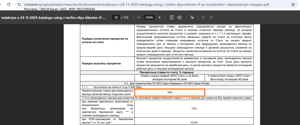 По накопительному «МТС Счёту» от «МТС Банка» с 24.11.25 в первые два месяца новичкам будет положено 18% годовых на ежедневный остаток до 5 млн руб. (с пакетом «Премиум» — 18% годовых на ежедневный остаток до 10 млн руб.).