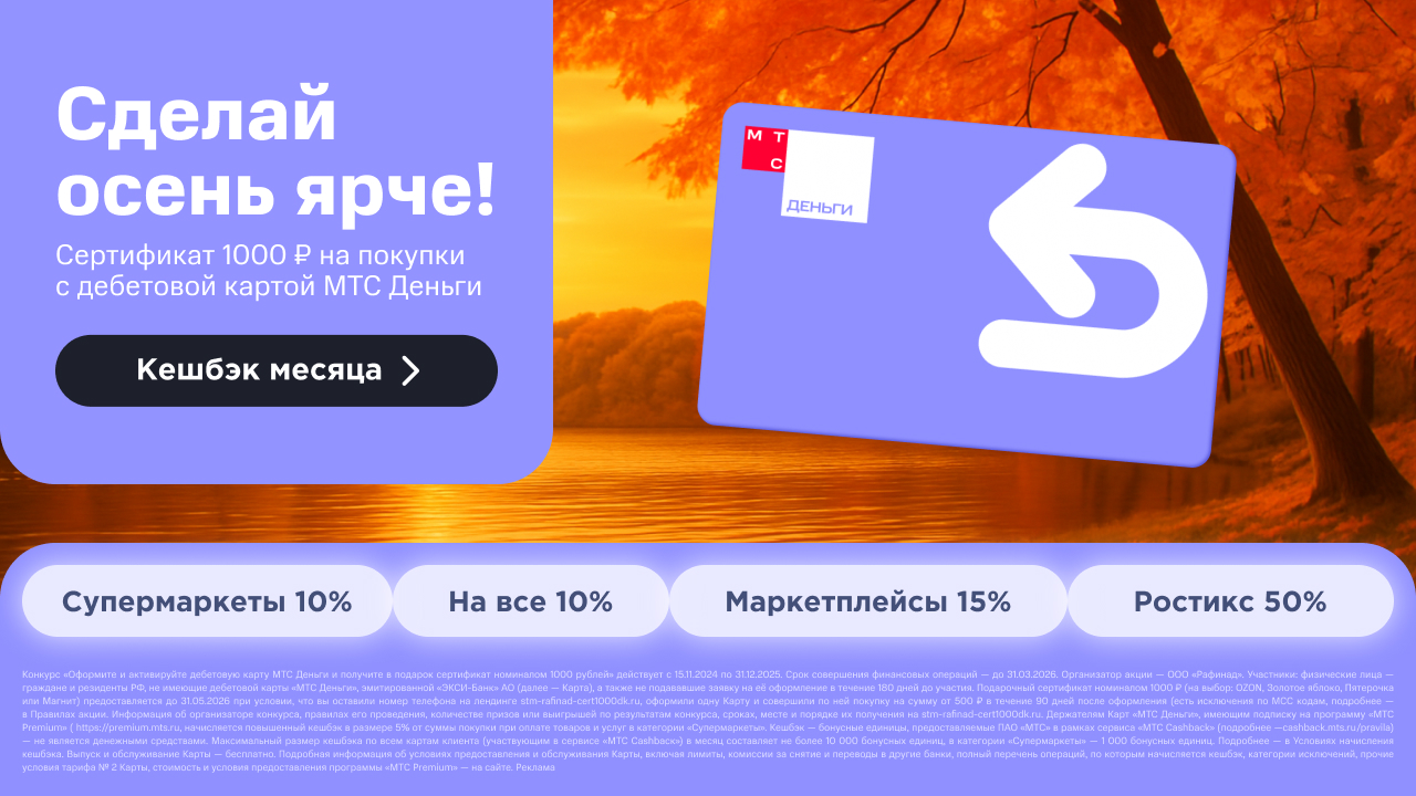 Если заказать бесплатную дебетовую карту «МТС Деньги» от «ЭКСИ-Банка» по этой ссылке и сделать первую покупку от 500 руб. (кроме списка исключений) в течение первых 30 дней, то в подарок будет положен сертификат на 1000 руб. на выбор в OZON/Золотое Яблоко/Магнит/Пятёрочку. Актуально для клиентов, у которых не было карты «ЭКСИ-Банка» и заявок на неё в прошлые 6 месяцев.