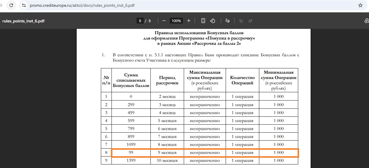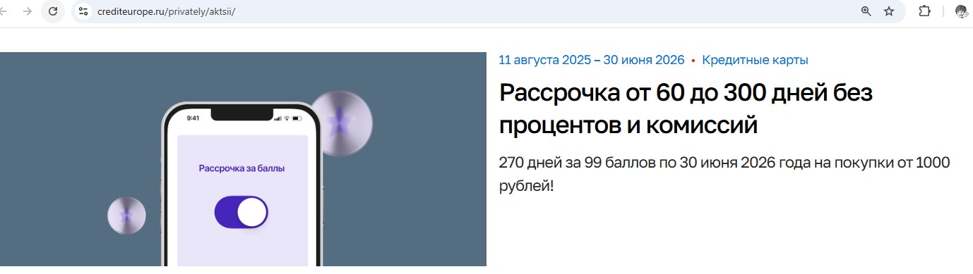 До 30.06.26 по кредитным картам «Кредит Европа Банка» (Urban Card, Card Credit Plus, Card Credit (карта рассрочки), Travelpass) покупки на сумму от 1 000 руб. за счет заёмных средств можно перевести в бесплатную рассрочку на 2 месяца, а на 9 месяцев всего за 99 баллов. Новые условия тут.