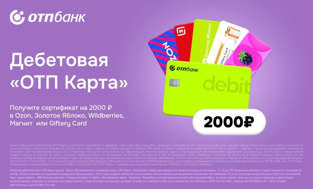 Если заказать «ОТП Карту» по этой ссылке до 30.04.26 и сделать любую покупку, то в подарок дадут сертификат на 2000 руб. на выбор в Ozon, Wildberries, Золотое Яблоко, Магнит или Giftery. Акция для клиентов, у которых минимум 2 года не было договора с банком, а также заявок на любой продукт в течение 180 дней.