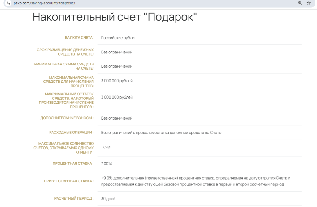 С 24.11.25 в «Примсоцбанке» появился новый накопительный счёт «Подарок» — 16% годовых на ежедневный остаток до 3 млн руб. новичкам в первые 2 расчётных периода (у «Социального» — 16,5% новичкам при получении пенсии на карту банка).