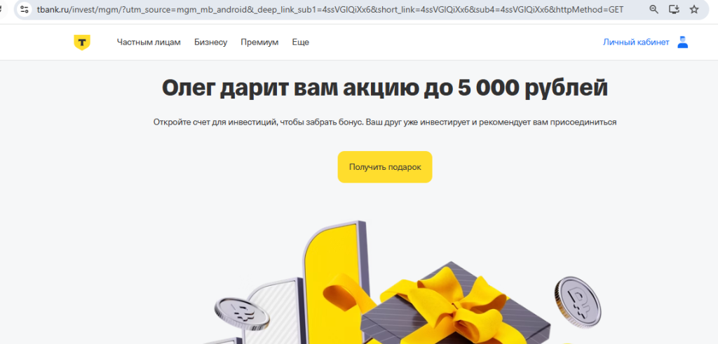 Если открыть брокерский счёт в «Т Инвестициях» по акции «Приведи друга», купить ценных бумаг на сумму от 10 000 руб. и не продавать их минимум 2 дня, то банк подарит акции на сумму до 5000 руб. Предложение актуально для клиентов, у которых минимум год не было брокерского счёта в «Тинькофф Банке».