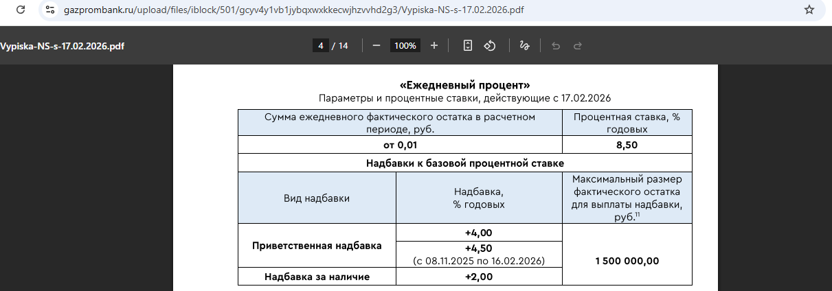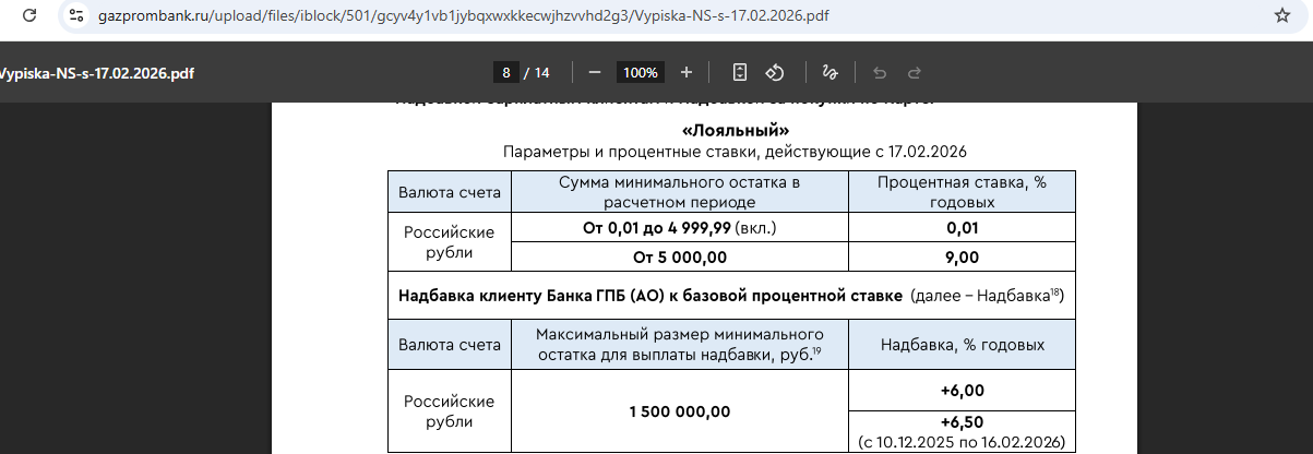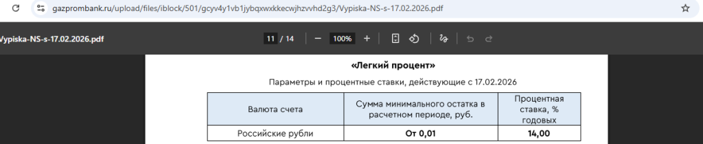 У «Газпромбанка» есть накопительный счёт «Легкий процент», где всем с 17.02.26 положено 14% годовых на любой минимальный остаток за месяц без дополнительных условий.