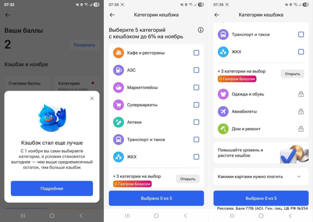 В приложении «Газпромбанка» появился выбор любимых категорий, они вполне хорошие («Кафе и рестораны», «АЗС», «Маркетплейсы», «Супермаркеты», «Аптеки», «Транспорт», «ЖКХ», «Одежда и обувь», «Авиабилеты», «Дом и ремонт»).
