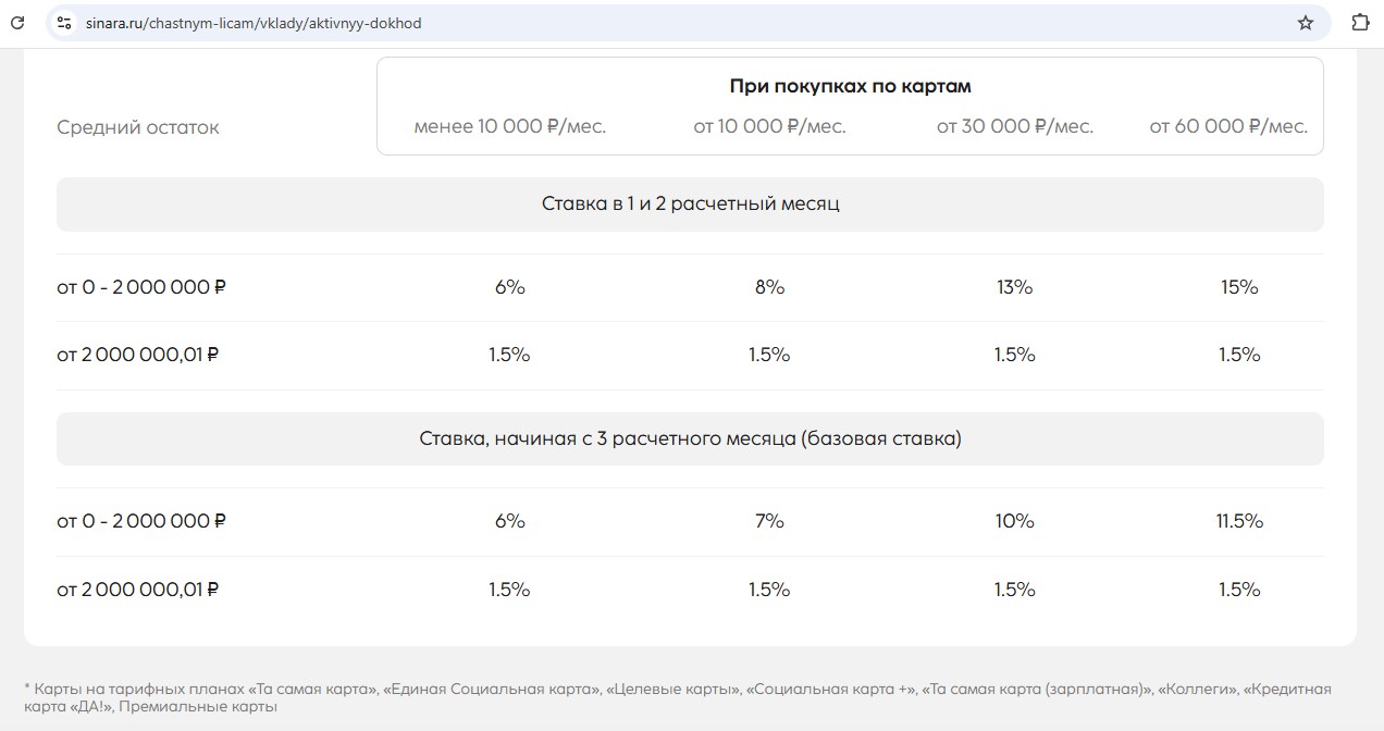 • По накопительному счёту «Активный доход» новичкам в первые два месяца на ежедневный остаток до 2 000 000 руб. при тратах по дебетовым и кредитным картам банка от 60 000 руб./мес. можно получить 15% годовых (при тратах от 30 000 руб./мес. — 13% годовых).