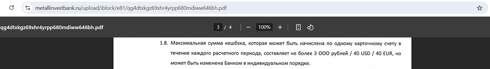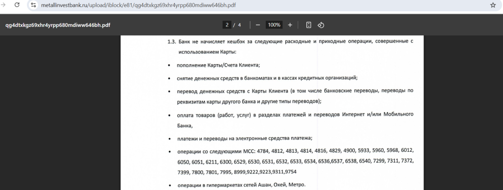 Список исключений: МСС 4812, 4814, 4816, 4829, 4899, 4900, 5933, 5960, 6012, 6050, 6051, 6211, 6300, 6399, 6529, 6530, 6534, 6535, 6536, 6537, 6538, 6540, 7278, 7299, 7399, 7511, 7801, 7802, 7995, 8641, 8651, 8661, 8999, 9211, 9222, 9223, 9311, 9405, 9754, покупки по СБП.