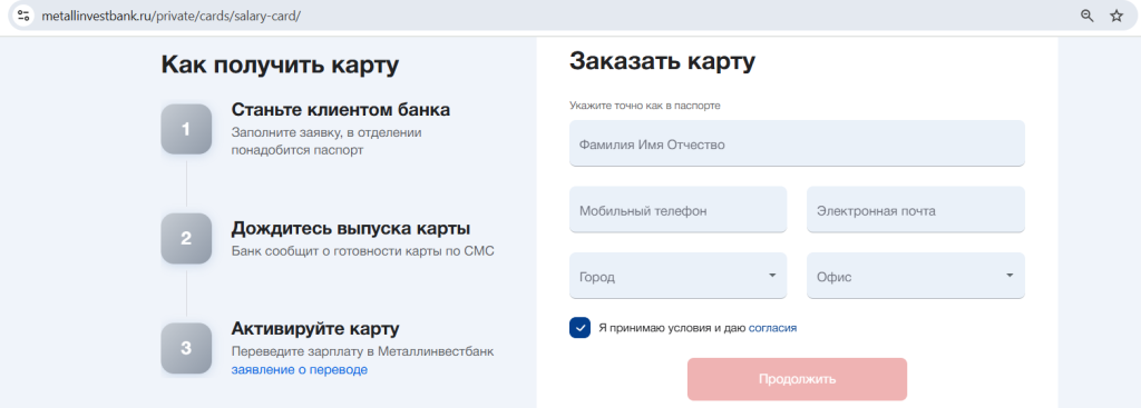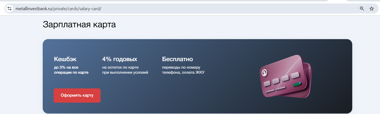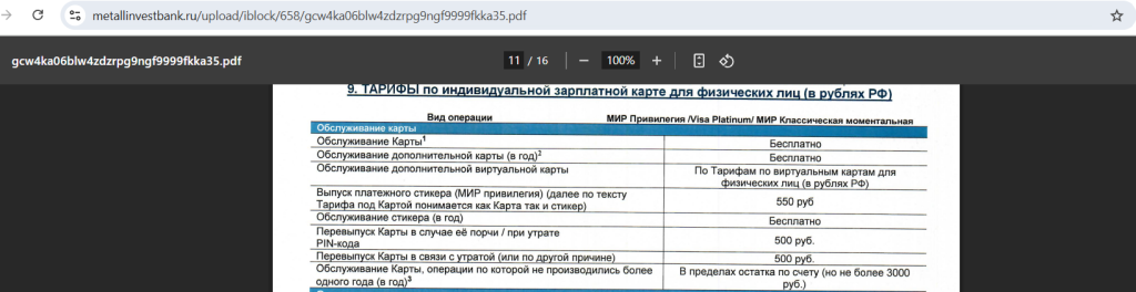 В «Металлинвестбанке» можно оформить карту с тарифом «Индивидуальная зарплатная карта», выпуск и обслуживание бесплатны, смс-информирование также без комиссии.