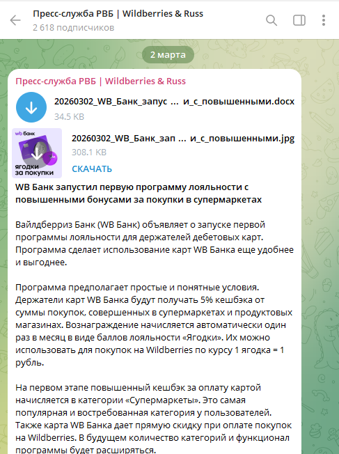 До 30.06.26 «Вайлдберриз Банк» обещает начислять 5% кэшбэка «ягодками» за покупки в супермаркетах по своей бесплатной карте (MCC 5310, 5311, 5331, 5411, 5422, 5441, 5451, 5462, 5499, 5921, 9751).