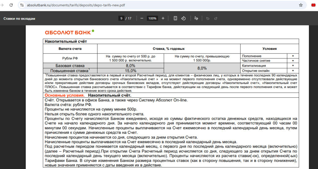 • Накопительный счёт в “Абсолют Банке” — 15% годовых (с 10.11) на остаток от 500 до 1 500 000 руб. новичкам в первые два месяца, потом и для неновичков сразу — 8% годовых;