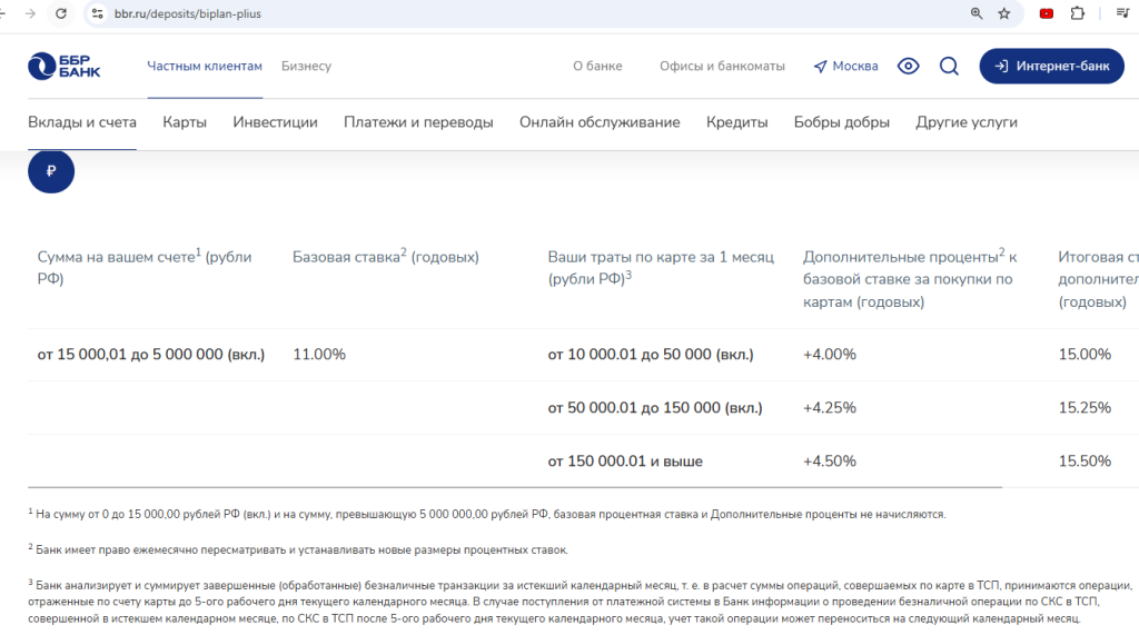 • Счёт “Биплан Плюс” от “ББР Банка” — 15% годовых на остаток от 15 000 до 5 000 000 руб. при тратах в текущем месяце по картам от 10 000 руб. (при тратах от 150 000,01 руб. — 15,5%, при тратах от 50 000,01 до 150 000 руб. — 15,25%). Ставка для всех.