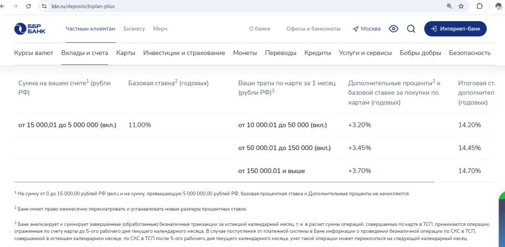 • Счёт “Биплан Плюс” от “ББР Банка” — 14,2% годовых на остаток от 15 000 до 5 000 000 руб. при тратах в текущем месяце по картам от 10 000 руб. (при тратах от 150 000,01 руб. — 14,45%, при тратах от 50 000,01 до 150 000 руб. — 14,7%). Ставка для всех.