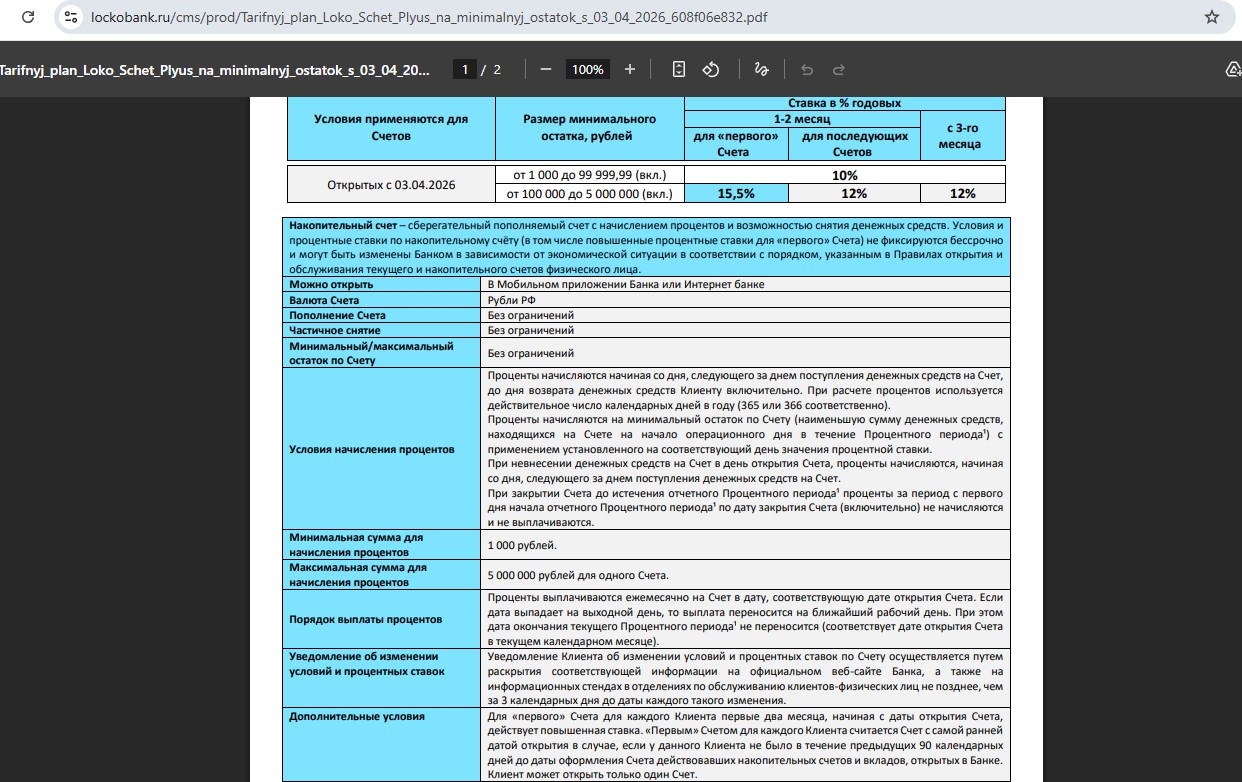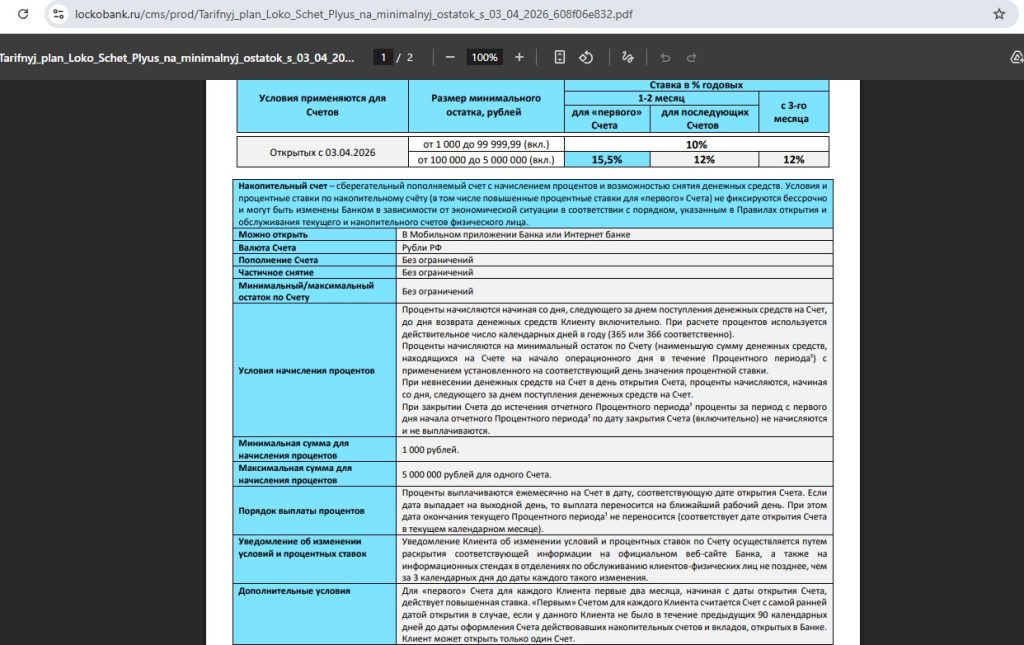 • “Локо-Счёт Плюс” от “Локо-Банка” — 15,5% годовых (с 03.04) на минимальный остаток от 100 т.р. до 5 млн руб. новичкам в первые 2 процентных периода, потом 12% годовых.