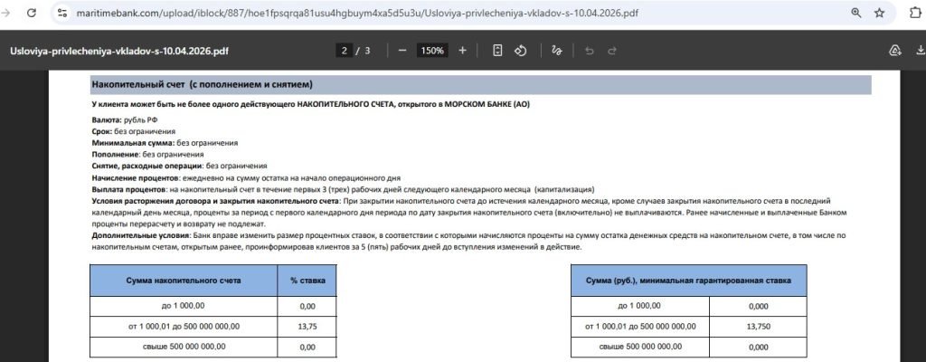 • Накопительный счёт банка “Морской” — 13,74% годовых (с 10.04) всем на ежедневный остаток от 1000 руб.