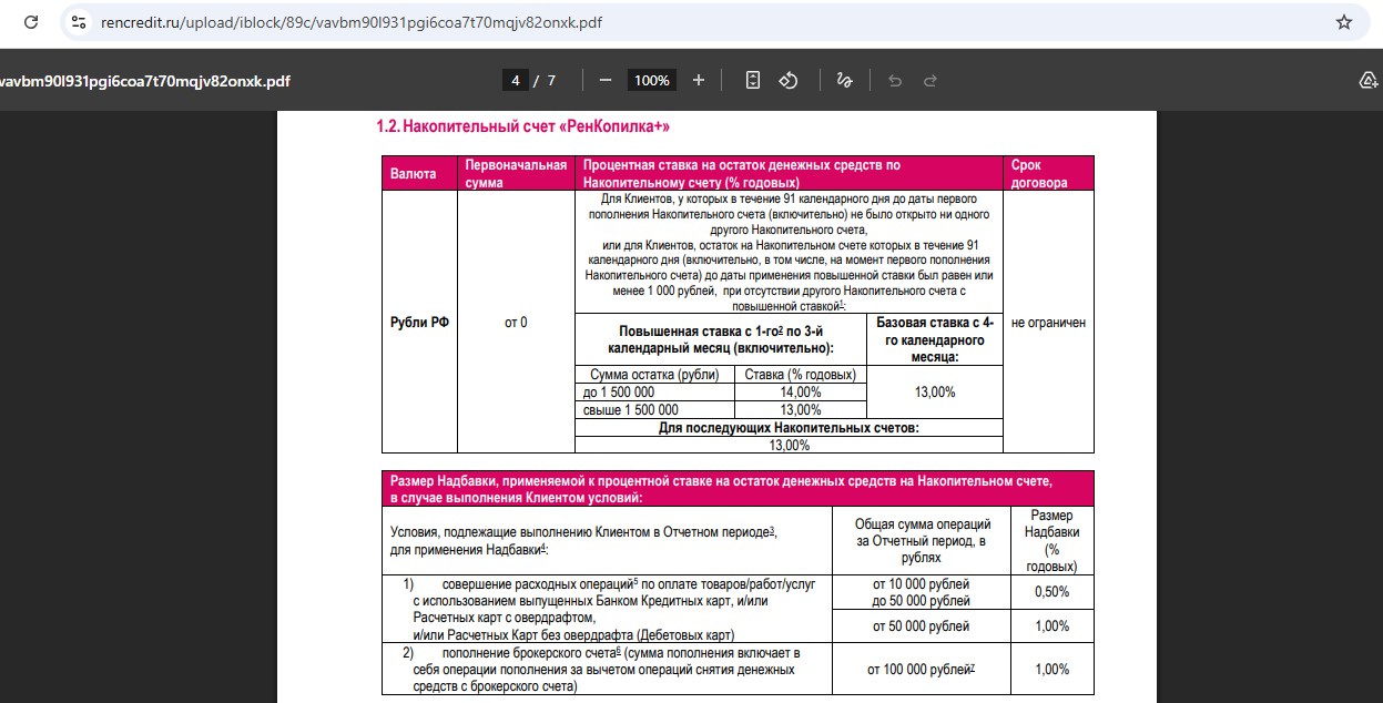 • “РенКопилка+” от “Ренессанс Банка” — 14% годовых (с 31.03) на минимальный остаток за месяц до 1,5 млн руб. в первые 3 месяца новичкам (потом 13% годовых). При тратах по картам в прошлом месяце от 10 000 руб. дадут +0,5% к ставке, при тратах от 50 000 руб. или при пополнении брокерского счёта от 100 000 руб. будет +1% к ставке.