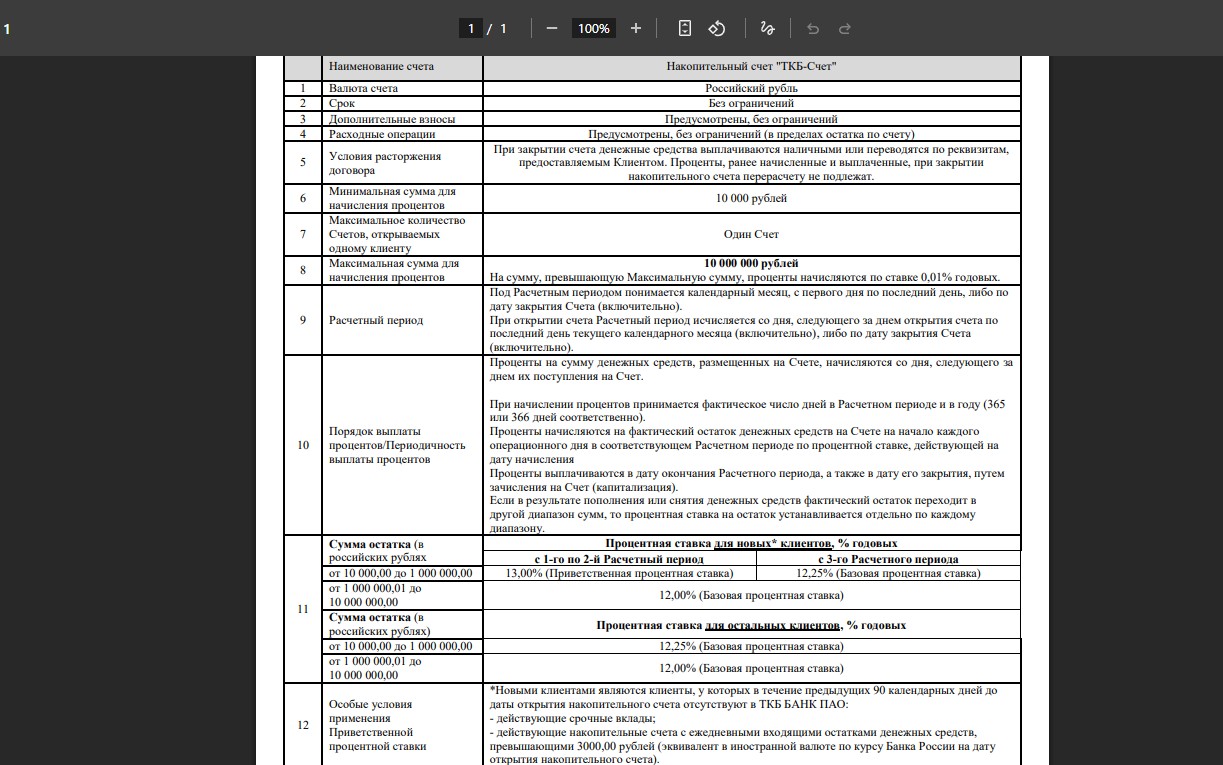 • “ТКБ-Счёт” от “ТКБ” — 13% годовых (с 09.04) новичкам в первые 2 мес. (12,25% остальным) на ежедневный остаток до 1 млн руб. (12% на больший остаток до 10 млн руб.).