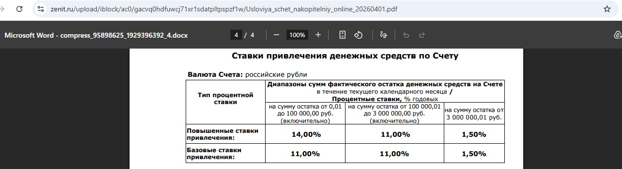 • “Накопительный онлайн” от “Банка Зенит” — 14% годовых (с 01.04) всем на остаток до 100 000 руб.