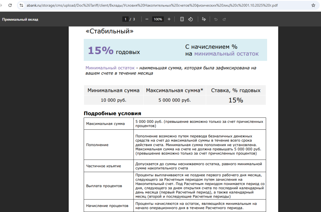 В банке «Александровский» есть накопительный счёт «Стабильный», где всем с 01.10.25 положено 15% годовых на минимальный остаток за месяц от 10 000 до 5 000 000 руб. Проценты начисляются в первый рабочий день следующего месяца: