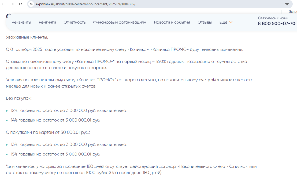 • “Копилка ПРОМО” от “Экспобанка” — 16% годовых (с 01.10) на любой ежедневный остаток новичкам в первый календарный месяц (потом базовая ставка для остатка до 3 млн руб. — 12% (с покупками от 30 000,01 руб./мес. — 13% годовых), для остатка более 3 млн руб. — 14% (с покупками от 30 000,01 руб./мес. — 15% годовых).