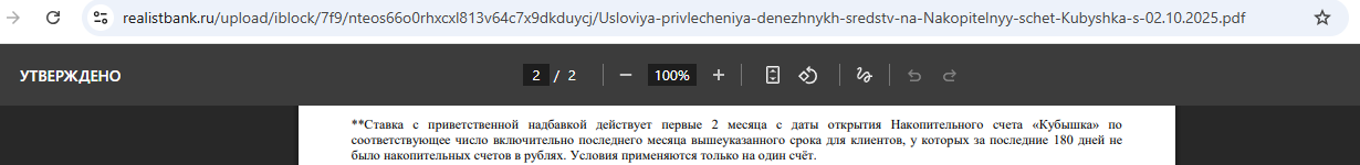 • “Кубышка” от банка “Реалист” — 15% годовых (16% с 2.10) на ежедневный остаток от 1000 руб. новичкам в первые 2 месяца.