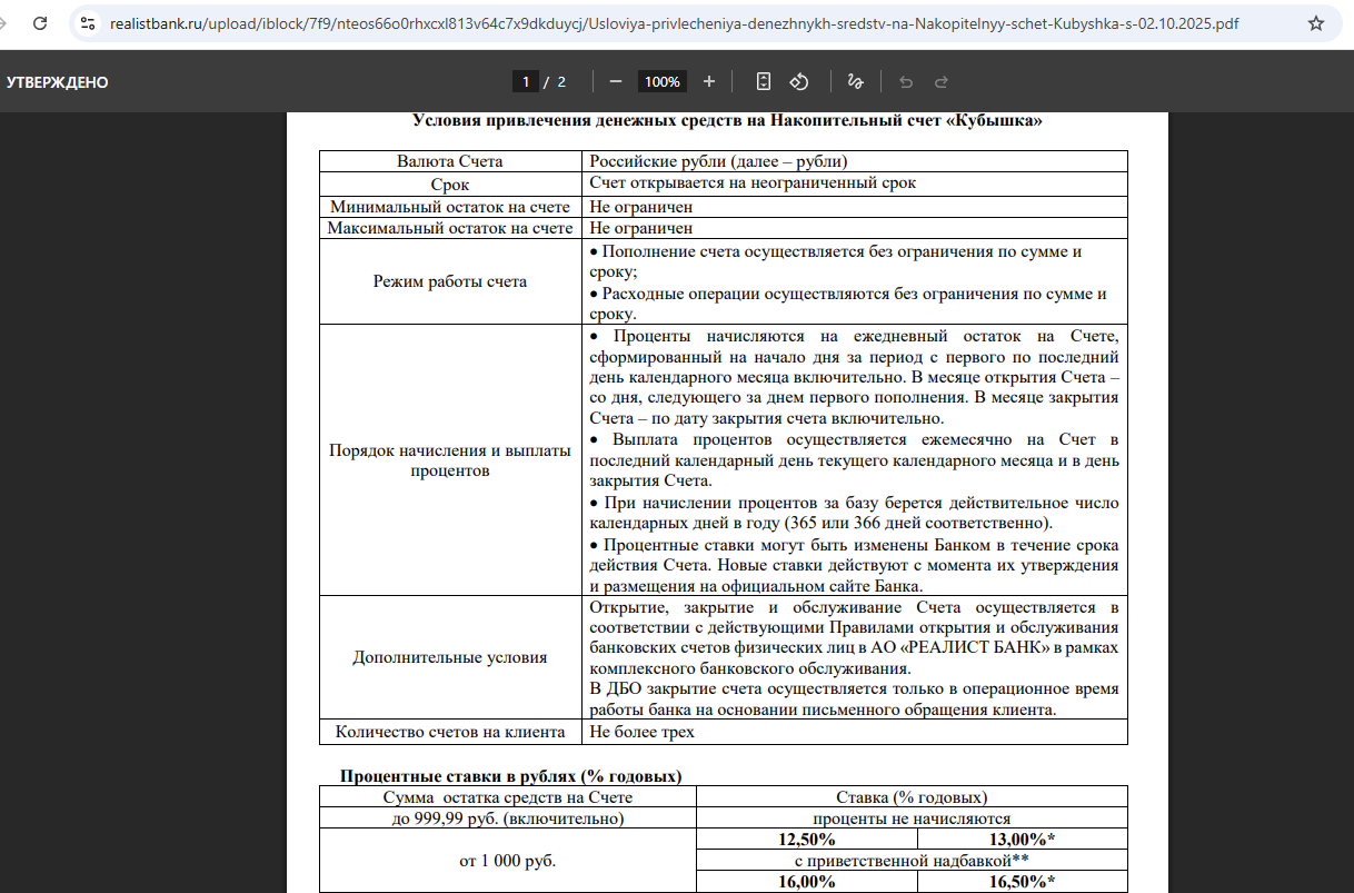 В «Реалист Банке» (116 место по России по активам нетто) есть накопительный счёт «Копилка», на котором с 22.09.25 всем положено 16% годовых на минимальный остаток за месяц от 1000 руб. без верхнего лимита: