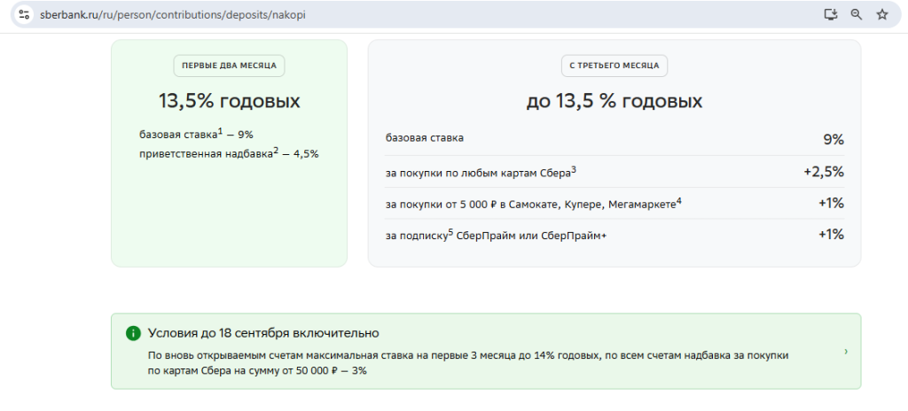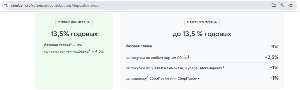 • Накопительный счёт от “Сбера” — 13,5% годовых на остаток до 10 000 000 руб. новичкам в первые 3 месячных периода. Доступен зарплатникам и пенсионерам. Если возможность открытия накопительного счёта обеспечена только наличием подписок “СберПрайм” и “СберПрайм+”, то верхний лимит начисления процентов — 1 000 000 руб., повторно новичком не стать.