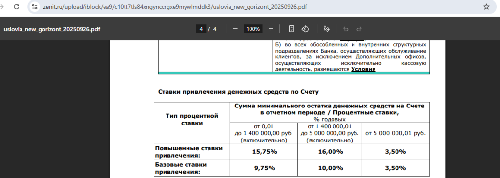 • “Новый горизонт” от банка “Зенит” — 16% годовых (с 26.09) на остаток от 1 400 000,01 руб. до 5 млн руб. (15,75% годовых при остатке до 1,4 млн руб.) новичкам в первые 3 месяца.