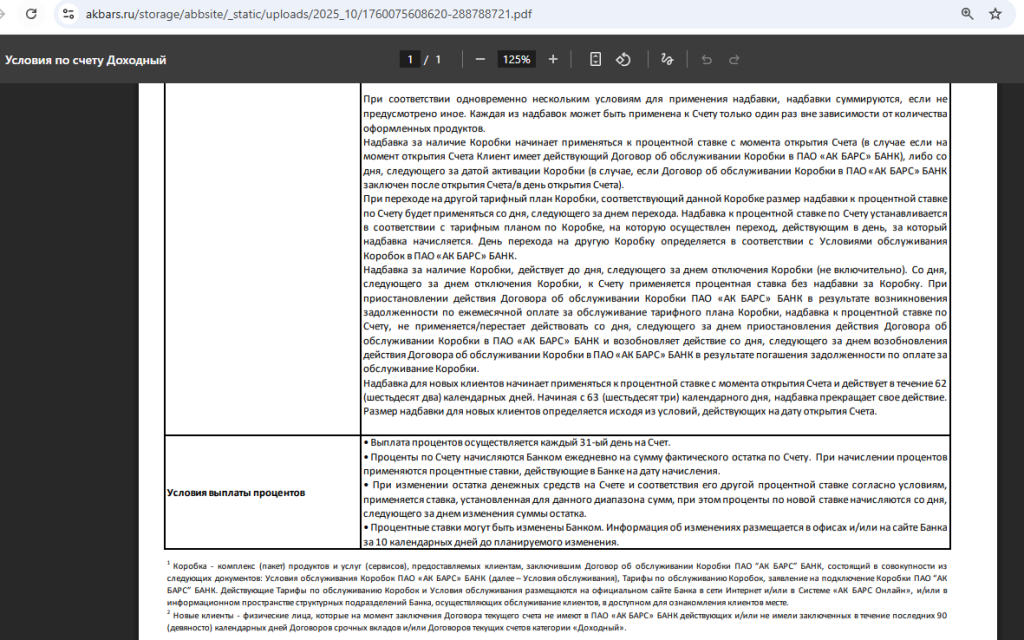 • Накопительный счет “МКБ” — 16,26% годовых (с 22.09) на остаток до 1,5 млн руб. (до 2 млн руб. с подпиской “Просто”) при покупках по картам от 100 000 руб./мес. (при меньших тратах сильно меньше, так при обороте от 50 000 до 100 000 руб./мес. — только 13,5%). При получении на карту пенсии/зарплаты — +1% годовых к ставке, за премиальный пакет — ещё +0,25%.