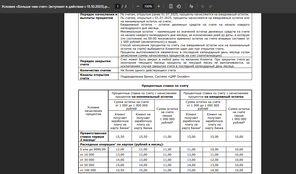 • “Больше чем счёт” в “ЦМРБанке” — 15,5% годовых (с 01.10) новичкам в первые два месяца на минимальный остаток до 1 млн руб.