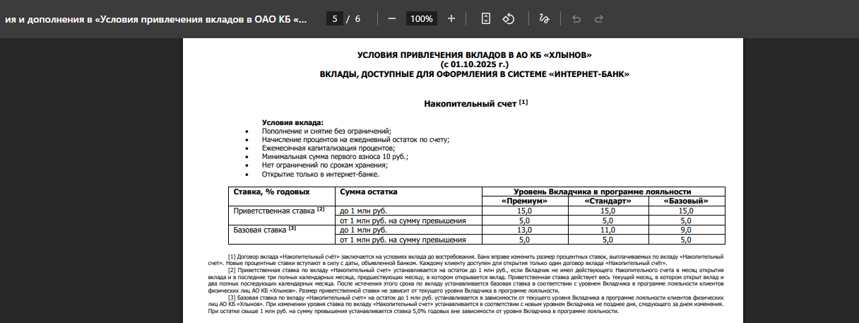 • Накопительный счет банка “Хлынов” — 15% годовых (с 01.10) на остаток до 1 000 000 руб. в первые 3 месяца (включая месяц открытия);