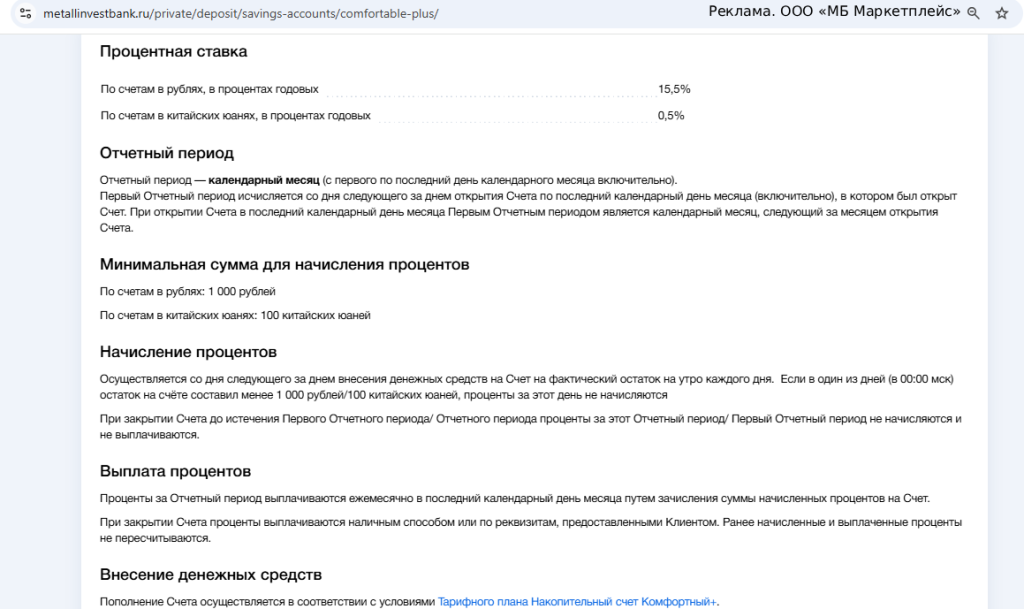 • Накопительный счёт “Комфортный+” от “Металлинвестбанка” — 15,5% годовых для всех на любой ежедневный остаток от 1000 руб.