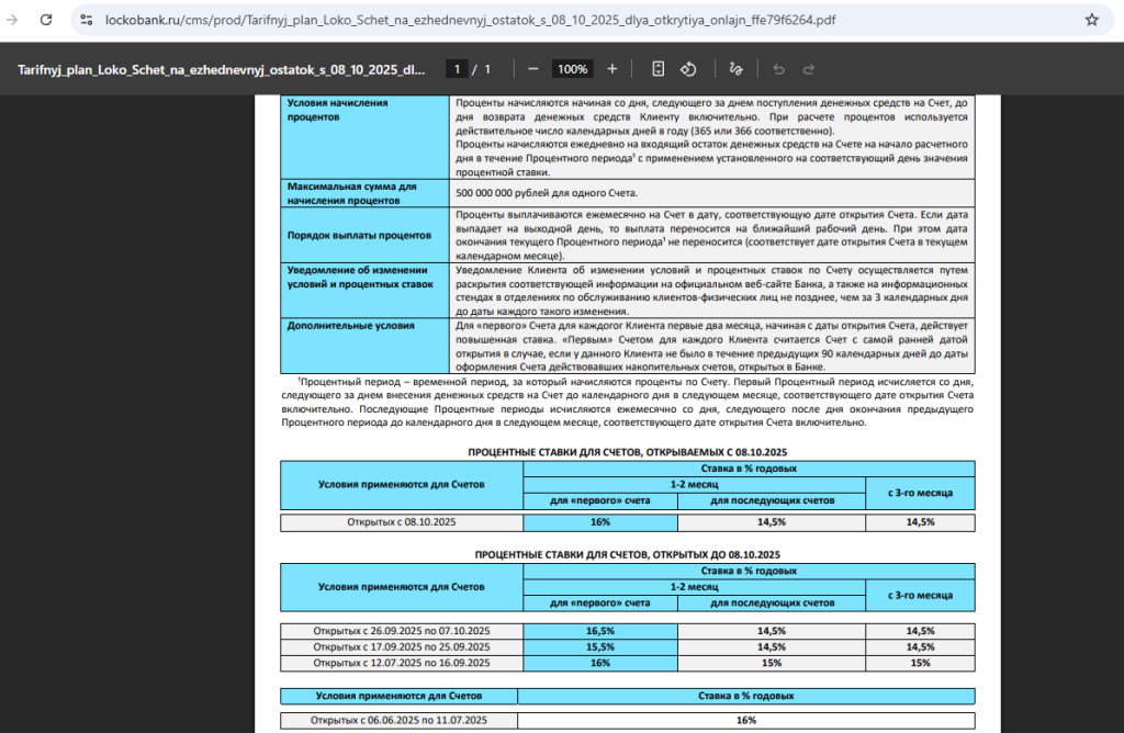 • “Локо-Счёт” от “Локо-Банка” — 16% годовых (с 08.10) на ежедневный остаток до 500 млн руб. в первые 2 месяца, потом 14,5% годовых.