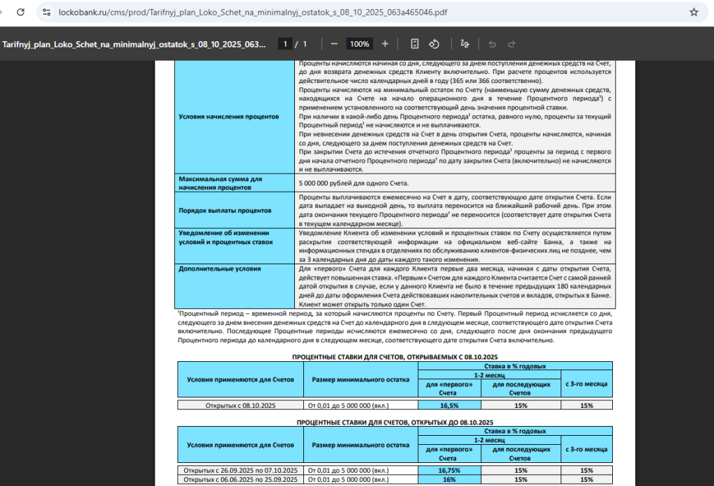 • “Локо-Счёт” от “Локо-Банка” — 16,5% годовых (с 08.10) на минимальный остаток до 5 млн руб. новичкам в первые 2 процентных периода, потом 15% годовых.