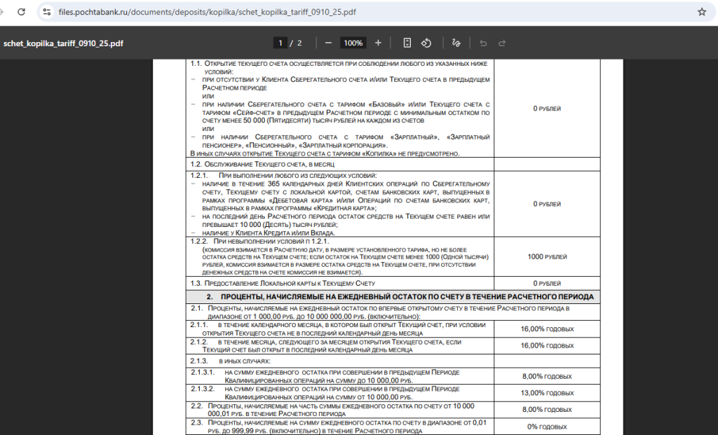 • “Копилка” от “Почта Банка” — 16% годовых (с 09.10) на остаток до 10 000 000 руб. в первый месяц без условий, потом — 13% годовых при тратах по картам от 10 000 руб./мес., повторно новичком не стать.