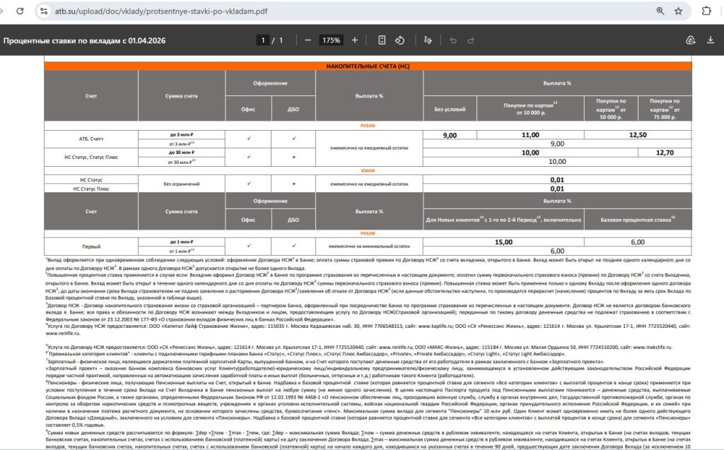 • Накопительный счёт “Премиум” от “Газпромбанка — 15% годовых (с 01.04) на минимальный остаток до 10 млн руб. в первые три месяца. Доля “Новых денег” должна быть от 50% + нужна подписка “Газпром Бонус Премиум” (за 2990 руб./мес. или бесплатно при выполнении условий);