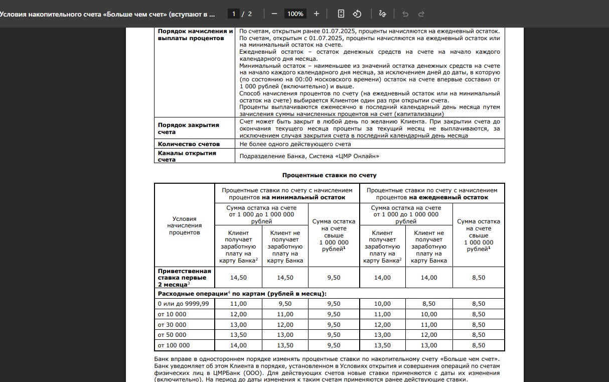 В небольшом банке «Центр международных расчётов» («ЦМРБанке») есть накопительный «Больше чем счёт», где новичкам в первые два месяца (календарных) с 01.04.26 положено либо 14% годовых на минимальный остаток до 1 млн руб., либо на 13,5% годовых на ежедневный остаток до 1 млн руб.