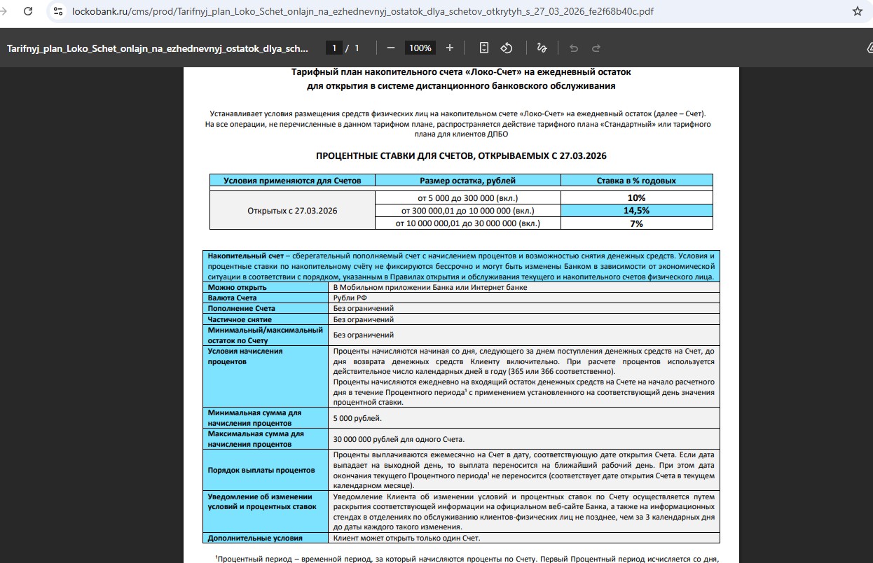• “Локо-Счёт” — 14,5% годовых на ежедневный остаток от 300 000 руб. до 10 млн для всех.