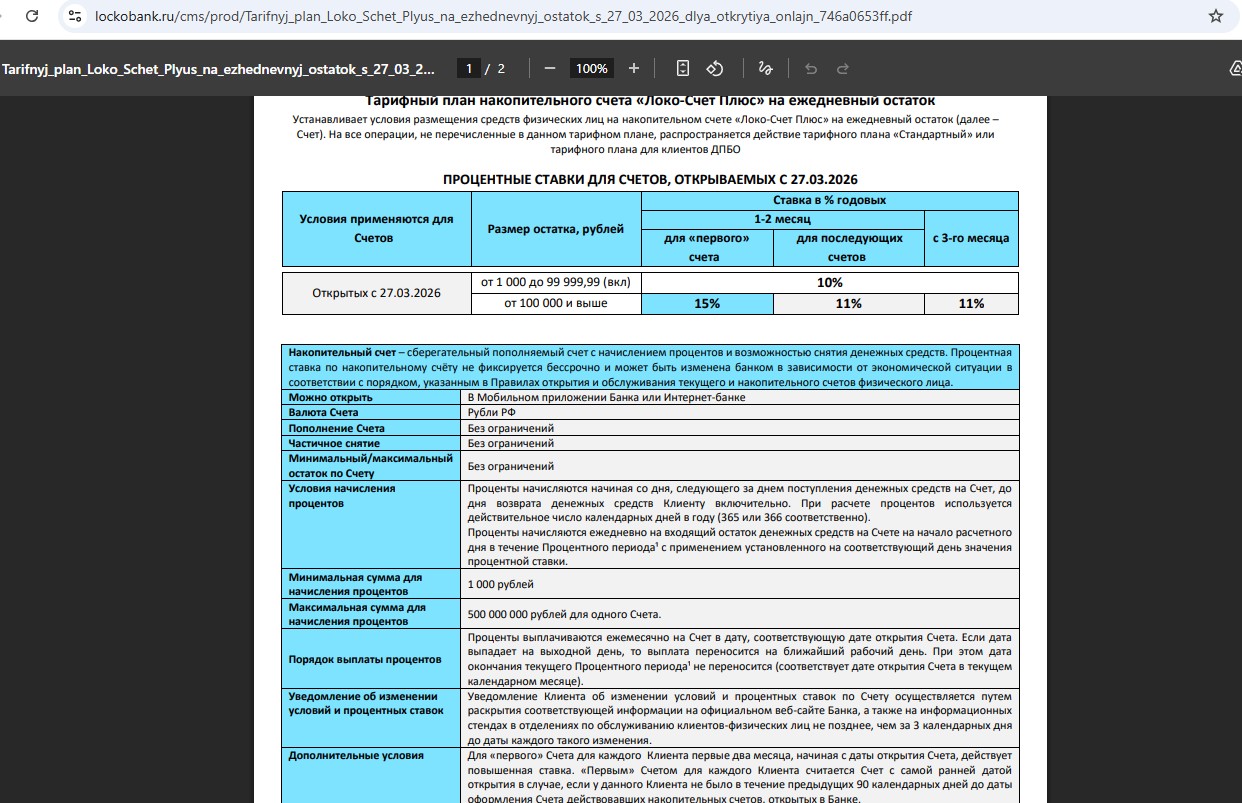 • “Локо-Счёт Плюс” от “Локо-Банка” — 15% годовых (с 27.03) на ежедневный остаток от 100 тыс. до 500 млн руб. в первые 2 месяца, потом 11% годовых.