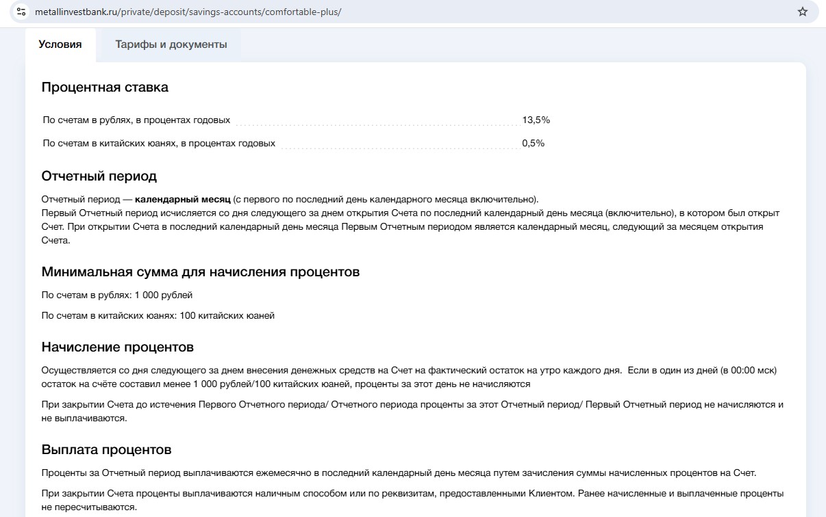 • Накопительный счёт “Комфортный+” от “Металлинвестбанка” — 13,5% годовых (с 27.03) для всех на любой ежедневный остаток от 1000 руб.
