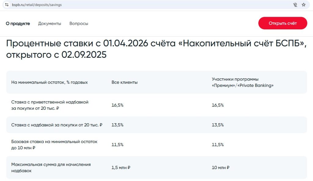 • “Накопительный счёт БСПБ” от банка “Санкт-Петербург” — 16,5% годовых (с 01.04) новичкам в первые 2 календарных месяца на минимальный остаток за месяц до 1,5 млн руб. (до 10 млн руб. для клиентов Премиум) при тратах от 20 000 руб./мес., потом, а неновичкам сразу, при таких тратах 13,5% годовых. Без трат 11,5% годовых.
