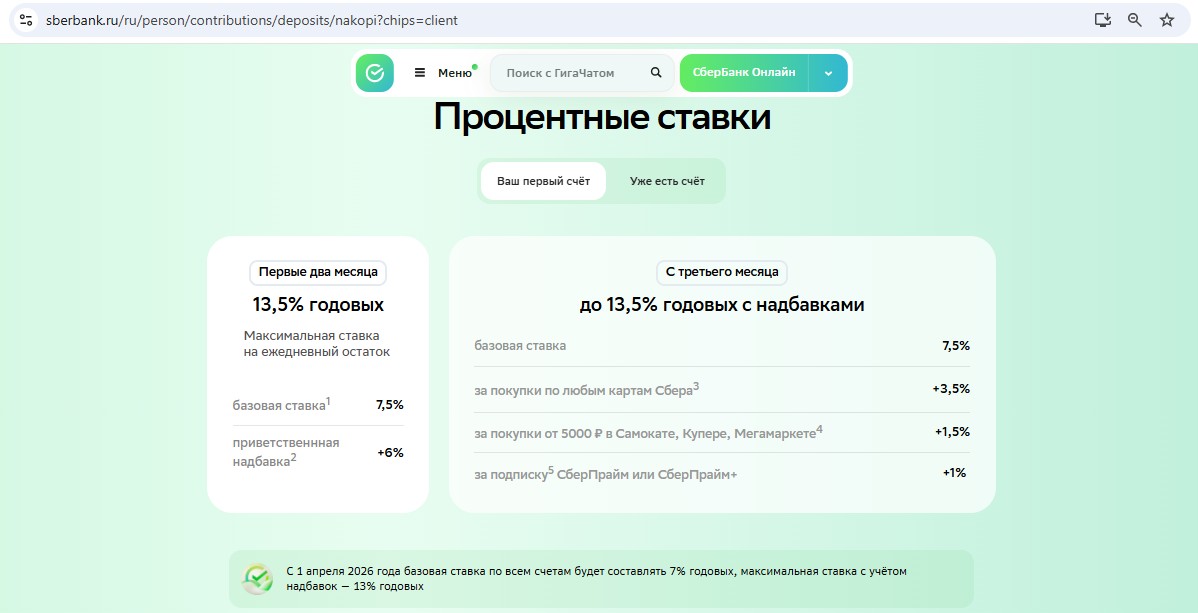 • Накопительный счёт от “Сбера” — 13% годовых (с 01.04) на остаток до 10 000 000 руб. новичкам в первые 2 месячных периода или потом с подпиской “СберПрайм”, покупках от 50 000 руб. и тратах в экосистеме Сбера от 5000 руб. Доступен зарплатникам и пенсионерам. Если возможность открытия накопительного счёта обеспечена только наличием подписок “СберПрайм” и “СберПрайм+”, то верхний лимит начисления процентов — 1 000 000 руб., повторно новичком не стать.