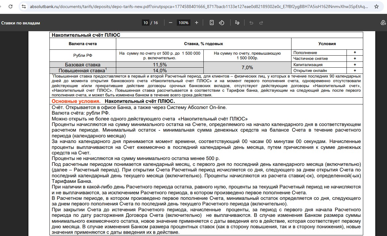 • “Накопительный счет Плюс” от “Абсолют Банка” — 14% годовых (с 01.04) на ежедневный остаток от 500 до 1 500 000 руб. новичкам в первые два месяца (потом, и для всех остальных сразу — 11,5% годовых).