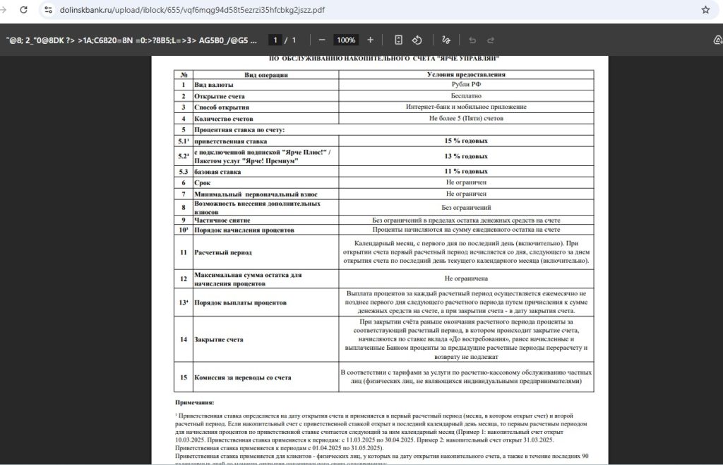 В банке «Долинск» на накопительном счёте «Ярче управляй» с начислением процентов на ежедневный остаток новичкам в первые два месяца (календарных) положена приветственная ставка, с 24.02.26 это 15% годовых на ежедневный остаток до 1 млн руб. Тарифы тут.