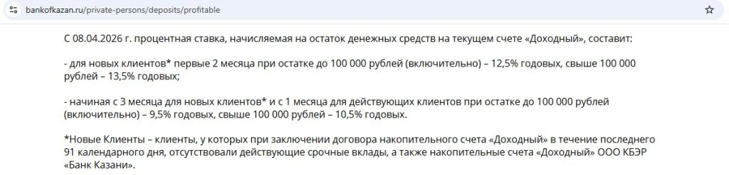 • Доходный от “Банка Казани” — 14% годовых (13,5% с 08.04) новичкам в первые 2 календарных месяца на ежедневный остаток от 100 тыс. руб.